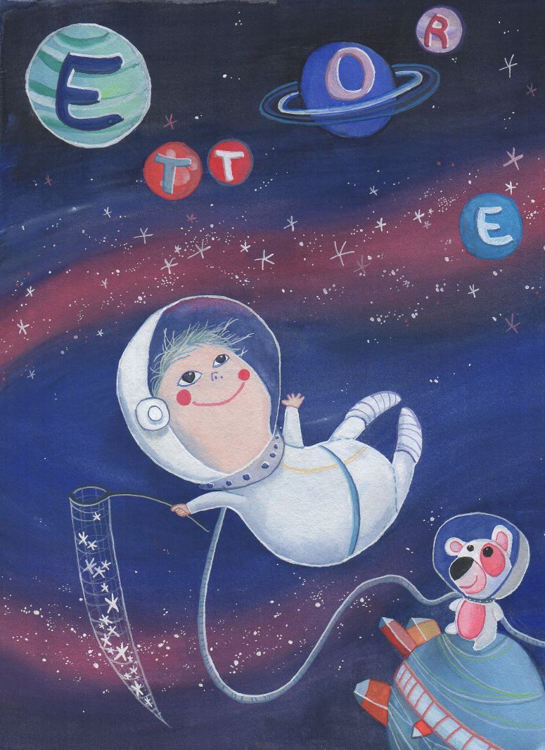 The portrait of this astronaut lauches the series of personalised illustration for babies and their nursery. The baby astronaut is a present for the baptism of a babyboy called Ettore's and it's been pretty